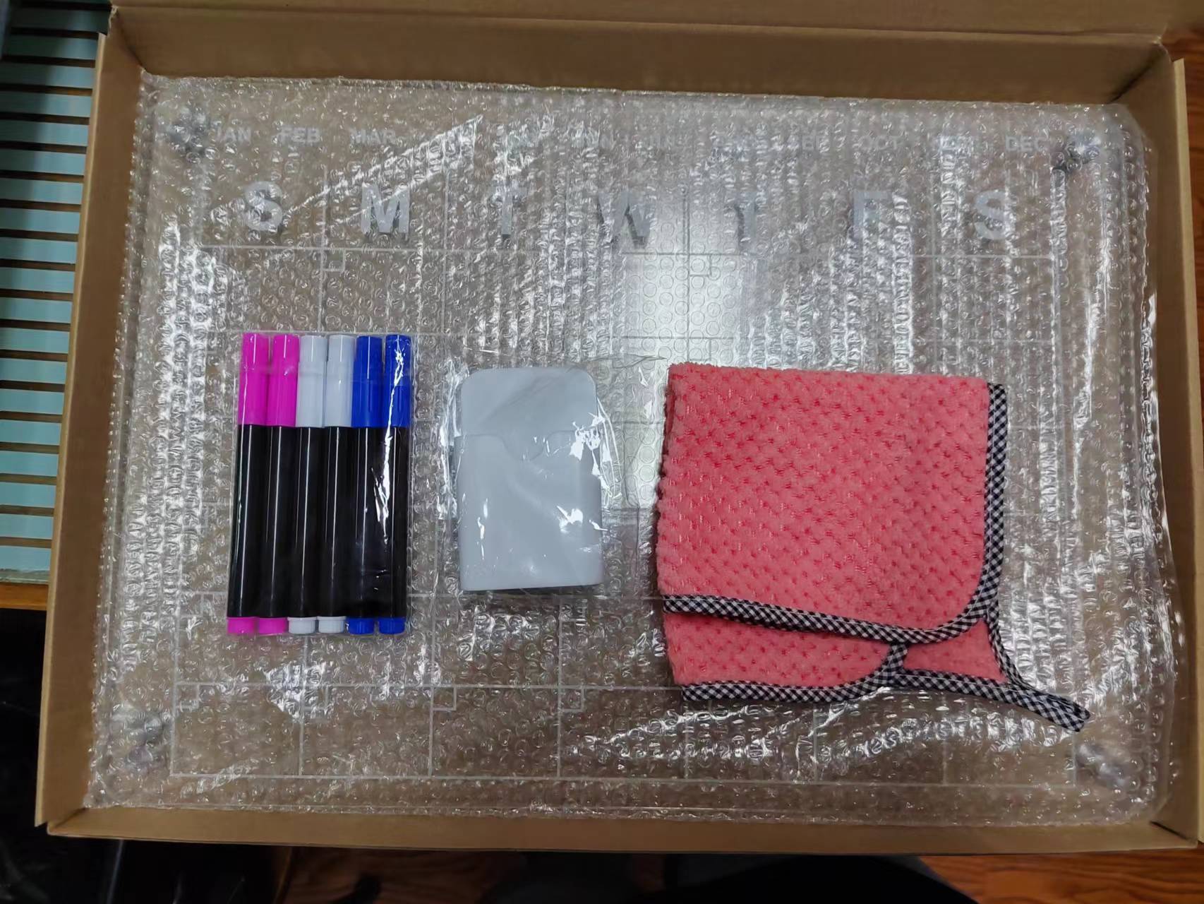 6Style: 43*30cm wet wipe (including 1 calendar +1 blank, 6 pens, pen box, wiping cloth)